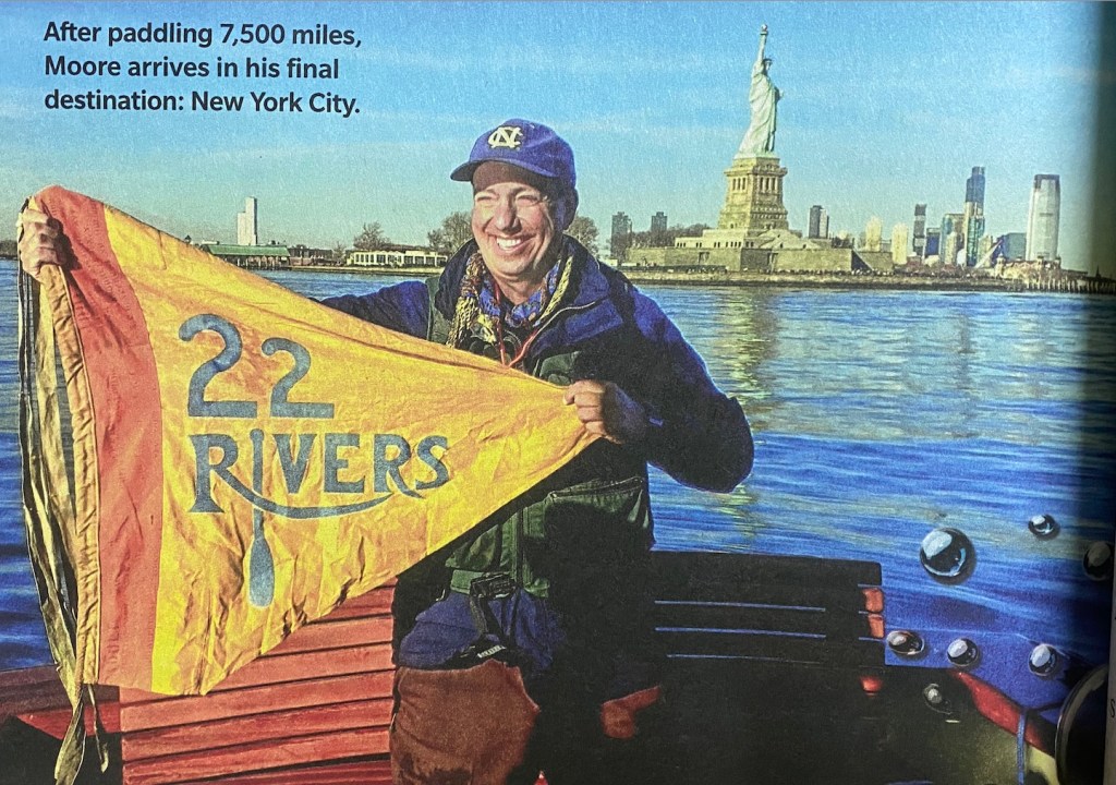 On December 14, 2021, shortly after his 50th birthday, Moore makes his final approach to New York City. The press comes out to observe the eccentric in his moment of triumph, and a contingent of kayakers and canoeists put in to join his victory lap around Lady Liberty. But near the George Washington Bridge, the winds come up so strong that he ends up with his bow pointed north, and he can’t safely turn it south again. Hell, he thinks, this whole trip has been about going the wrong way anyway. So he paddles stern-first the rest of the way.