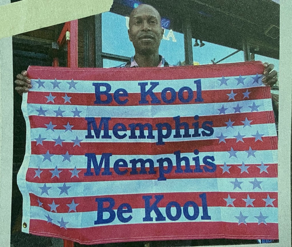 In Memphis, on the day of the 2020 election, the political tension is palpable. Private security details patrol the streets. Moore takes a seat at BB King’s Blues Club on Beale Street to see how things will go. He hears a commotion — not trouble, but laughter. Outside, a man is running with a flag in his hand, on which is printed “BE KOOL MEMPHIS.” He is posing for pictures with tourists, lightening the mood. Moore gets up from his lunch to introduce himself to the man, who calls himself Downtown Tat.